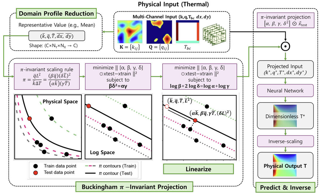 연구팀이 개발한 알고리즘은 '학습 범위 밖의 입력'을 물리 법칙을 지키면서 학습 범위 안의 '익숙한 형태'로 바꿔주는 역할을 한다. 새로운 입력 데이터가 들어오면, 먼저 π 값을 기준으로 기존에 학습한 데이터 중 물리적으로 가장 유사한 데이터를 찾아, 그와 비슷한 조건으로 맞춘 뒤에야 인공지능 모델에 입력해 계산하도록 하는 것이다.