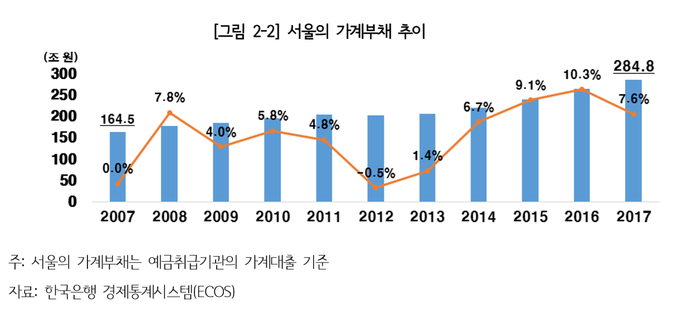 4일 서울연구원의 '서울시 가계부채 진단과 정책방향' 연구보고서에 따르면 한국은행 통계를 분석한 결과 서울지역 가계부채는 예금취급기관 대출 기준으로 2010년 195조원에서 2017년 285조원으로 90조원 증가했다.