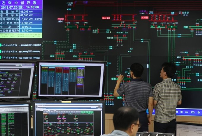 ▲ 최대전력수요가 역대 최고치를 기록한 23일 오후 경기도 수원시 한국전력공사 경기지역본부 전력관리처 계통운영센터에서 관계자들이 전력수급상황을 살펴보고 있다. [연합뉴스 제공]