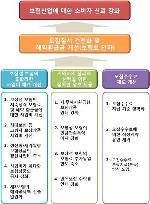 모집 수수료는 분할지급 방식을 도입한다. 보험산업의 가장 큰 폐단으로 꼽히는 모집 수수료 선지급 방식을 개선하는 것이다. 수수료를 선지급하면 소비자는 친척이나 지인 등의 권유 때문에 어쩔 수 없이 보험에 가입했다가 조기에 해약할 경우 과도하게 해약공제액이 책정돼 환급금을 덜 받게 되는 피해를 본다.
