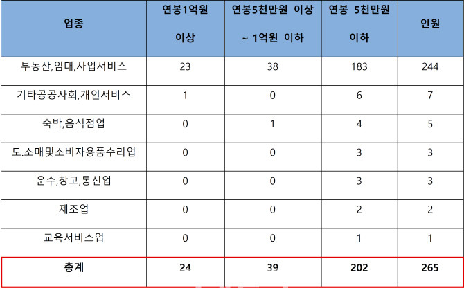 소득 구간별로 보면 연봉 1억원 이상 부동산임대업자가 23명, 5000만~1억원이 38명, 5000만원 아래가 183명으로 집계됐다.