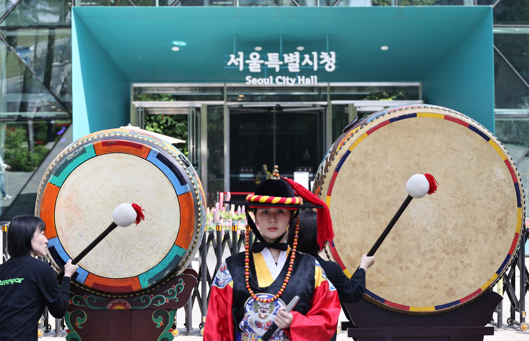 지방선거를 한 달여 앞둔 29일, 그린피스는 서울시청 앞에 '기후 신문고'를 설치하고 서울시장 후보들을 향해 온실가스 감축을 위한 예산 공약 마련을 요구했다.