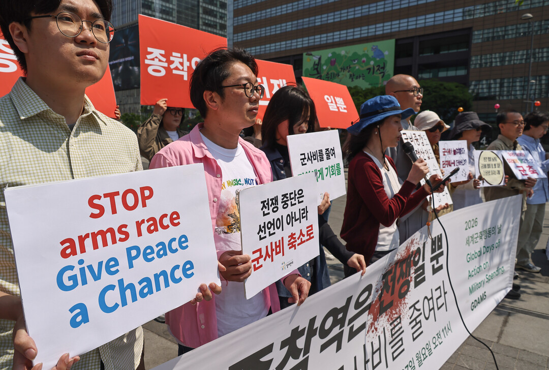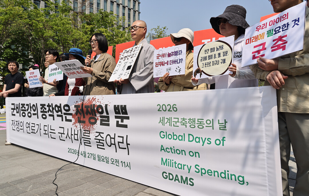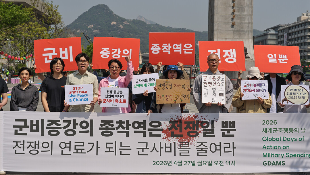 2026 세계군축행동의 날(Global Days of Action on Military Spending, GDAMS)을 맞아 27일 오전 서울 종로구 광화문광장에서 시민사회단체들이 <군비증강의 종착역은 전쟁일 뿐 – 전쟁의 연료가 되는 군사비를 줄여라>를 주제로 기자회견을 열었다.