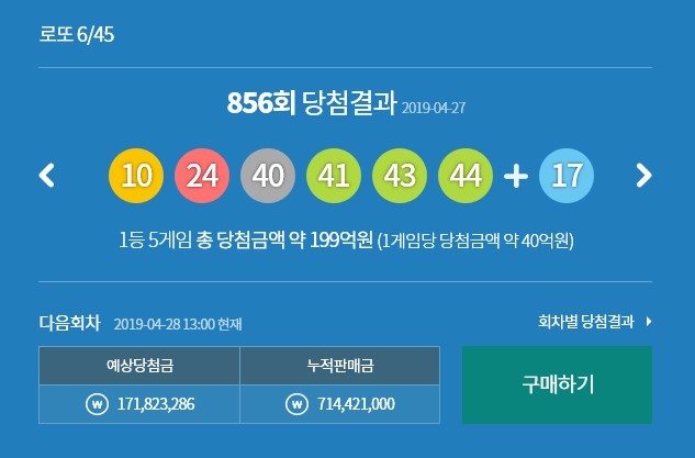 27일 로또 수탁업체 동행복권은 복권통합포털을 통해 제856회 로또복권 당첨번호를 공개했다. 이날 발표된 1등 당첨번호는 10, 24, 40, 41, 43, 44며 2등 보너스번호는 17이다.