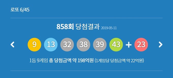 11일 로또 수탁업체 동행복권은 복권통합포털을 통해 제858회 로또복권 당첨번호를 공개했다. 이날 발표된 1등 당첨번호는 9, 13, 32, 38, 39, 43이며 2등 보너스번호는 23이다.