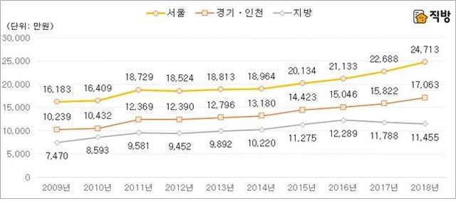 22일 부동산정보서비스 직방이 2009년 이후 지역별 오피스텔 실거래가격을 분석한 결과 지난해부터 서울과 그 외 지역 간 가격 격차가 벌어지는 것으로 나타났다.