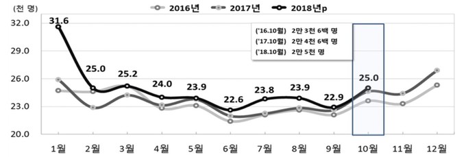 올해 10월 사망자 수는 2만5000명으로 1년 전(2만4600명)보다 400명(1.6%) 증가했다. 1~10월 사망자는 24만7900명으로 작년 같은 기간보다 5.8% 많았다.