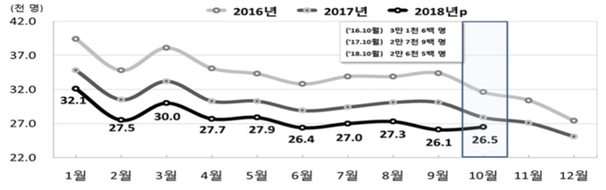 통계청이 26일 발표한 '2018년 10월 인구동향'에 따르면 올해 10월 출생아는 2만6500명으로 지난해 10월보다 1400명(-5.0%) 감소했다. 출생아는 올해 1월(3만2100명)과 3월(3만명)에만 3만명대를 기록했고, 나머지 8개월은 2만명대에 머물렀다.