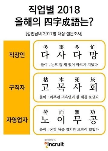 10일 취업포털 인크루트에 따르면 지난 5~7일 직장인을 비롯한 성인남녀 2971명을 대상으로 올해 '자신의 사자성어'를 설문 조사한 결과 이같이 확인됐다. 다사다망은 '일이 많아 몹시 바쁘다'는 의미로 전체의 14.2%가 선택했다.