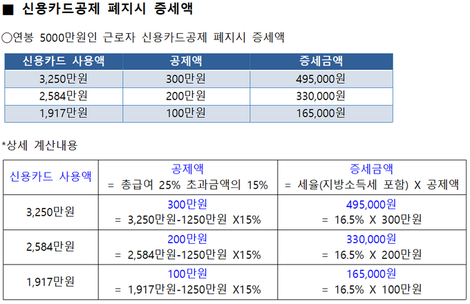 같은 방식으로 연봉이 5000만원인 직장인이 신용카드로 2584만원 사용해 공제를 200만원 받았다면 33만원이, 1917만원을 써 공제를 100만원 받았다면 17만원이 각각 증세된다.