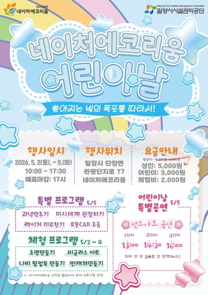 밀양시시설관리공단은 5월 2일부터 5일까지 선샤인 테마파크에서 가족 단위 방문객을 위한 '제3회 네이처에코리움 어린이날 행사'를 개최한다.