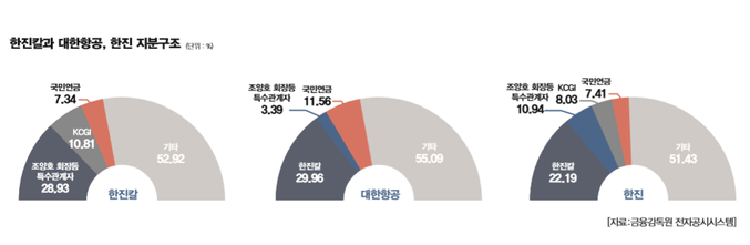 그러나 KCGI가 가진 지분으로는 조 회장 경영권이 크게 흔들리진 않는다. 한진그룹의 지주사인 한진칼의 경우 최대 주주인 조 회장(17.70%)과 특수관계인들이 지분 28.93%를 가지고 있다. 한진은 한진칼(22.19%)과 조 회장(6.87%)을 비롯한 특수관계인 보유 지분이 33.13%다. KCGI가 한진칼과 한진의 2대주주이긴 하지만 각각 10.81%, 8.03%의 지분율로는 경영권에 제동을 걸기 쉽지 않다.