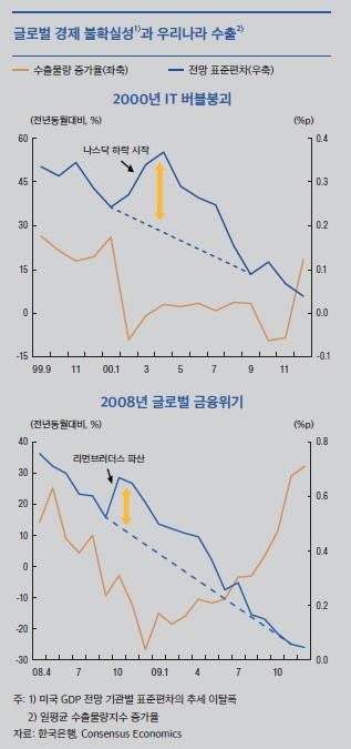 2000년 IT 버블이 꺼지면서 나스닥지수는 급락했고, 경제의 불확실성도 이때부터 커지면서 한국의 수출 물량이 감소했다. 2008년 금융위기 때도 리먼브러더스 파산을 기점으로 불확실성이 커졌고 한국 수출물량은 급감했다.