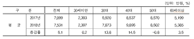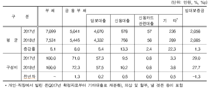 20일 통계청·한국은행·금융감독원이 발표한 '2018년 가계금융·복지조사'에 따르면 올 3월 말 기준 가구당 평균 부채는 7531만원으로 지난해(7099만원)보다 432만원(6.1%) 증가했다. 부채를 지닌 가구 비율도 1년 전보다 0.2%포인트 증가한 63.7%를 기록했다.