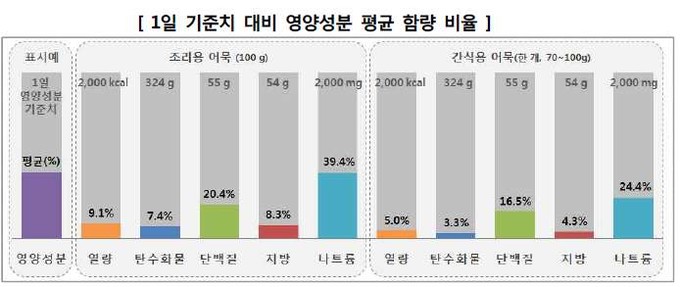 시험 결과 21개 제품의 영양성분은 1회 섭취량(조리용 100g, 간식용 한 개) 당 나트륨이 1일 영양성분 기준치 대비 33.7%, 단백질은 18.9% 높은 수준을 보였다. 평균 열량은 1일 에너지 필요량 대비 7.5%, 지방 함량은 1일 영양성분 기준치 대비 6.9% 낮은 편이었다.