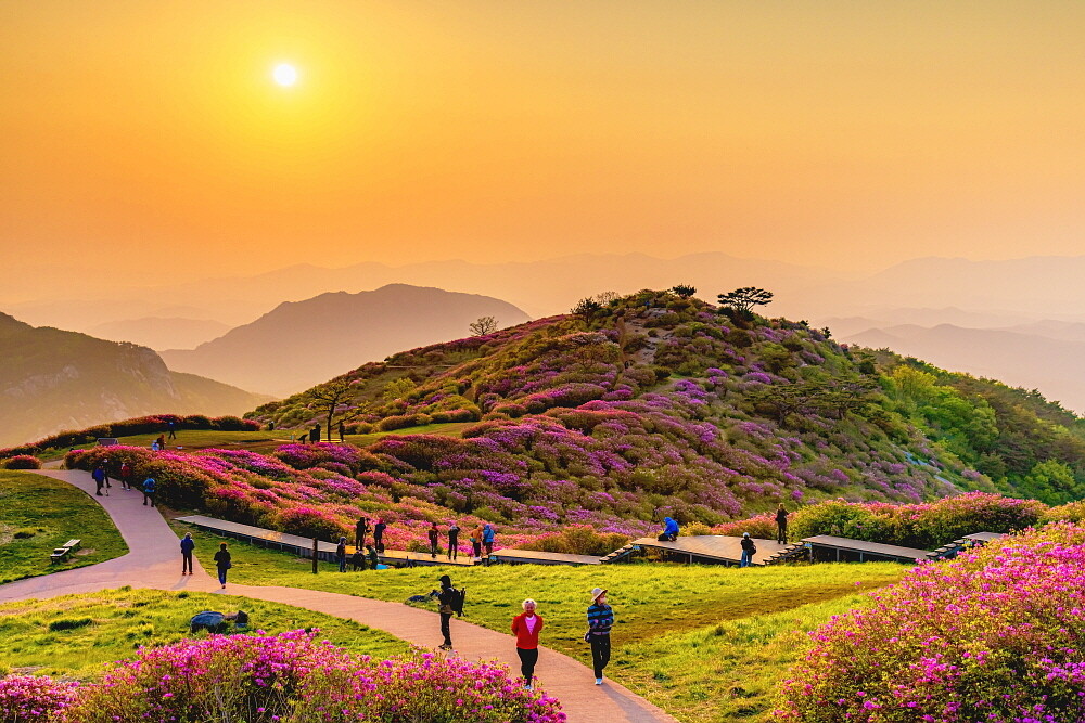 ▲ 지난해 이맘때, 이른 새벽 떠오른 태양빛을 받은 철쭉 사이의 무장애 길을 이용해 능선 위로 걸어 오르는 노부부의 뒷모습 [김도형 기자]