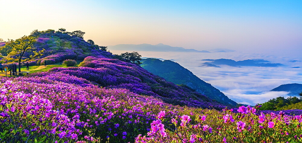 ▲황매산 해발 800m 고지 위에서 바라본 철쭉과 산 아래 흐르는 구름들이 어우러져 장관을 이루고 있다. [김도형 기자]