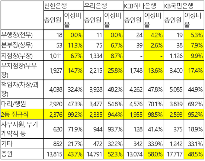 하나은행의 경우 사무지원·무기계약직 여성 비율이 41.4%, 2등 정규직은 98.5%, 대리·행원은 70.1%, 책임자는 47.8%, 부지점장은 13.6%, 본부장은 2.6%였다.