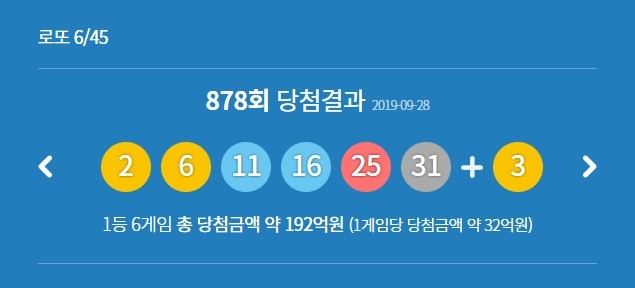지난 28일 로또 수탁업체 동행복권은 복권통합포털을 통해 제878회 로또복권 당첨번호를 공개했다. 이날 발표된 1등 당첨번호는 2, 6, 11, 16, 25, 31이며 2등 보너스번호는 3이다.