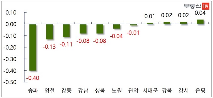▲ 서울 주요지역 주간 매매가격 변동률 [부동산114 제공]