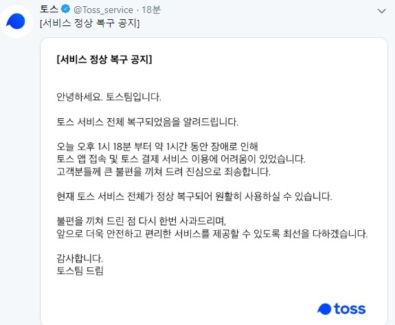 토스팀은 이날 오후 공식트위터를 통해 "현재 토스 앱 접속이 원활하지 않으며, 토스 결제 서비스(토스카드 결제 및 온라인 가맹점 내 토스 결제) 사용이 불가하다. 사용자 분들께 불편을 끼쳐드리게 되어 진심으로 죄송하다"며 "최대한 빠르게 복구될 수 있도록 최선을 다하겠다"고 밝혔다.