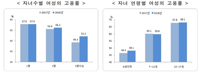 자녀가 많거나 어릴수록 워킹맘의 고용률도 낮았다. 자녀 수 1명인 경우 고용률은 57.9%, 2명은 56.2%, 3명 이상은 52.1%였다. 막내 아이가 6세 이하인 경우 48.1%, 7∼12세인 경우 59.8%, 13∼17세인 경우 68.1%였다.