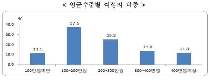 이들의 임금수준을 보면 월 100만원 이상∼200만원 미만이 37.6%로 가장 많았다. 100만원 미만은 11.5%였다. 절반 가까운 49.1%가 월 임금이 200만원 미만인 셈이다. 200만∼300만원 미만은 25.3%, 300만∼400만원 미만은 13.8%, 400만원 이상은 11.8%였다.