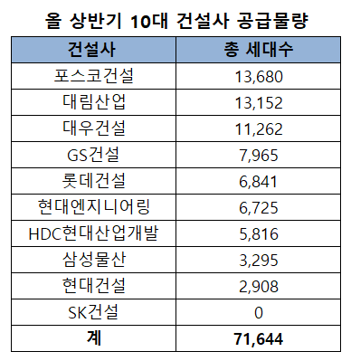 이 외에도 GS건설이 7965가구, 롯데건설이 6841가구, 현대엔지니어링이 6725가구, HDC현대산업개발이 5816가구, 삼성물산이 3295가구, 현대건설이 2908가구를 분양할 예정이다.