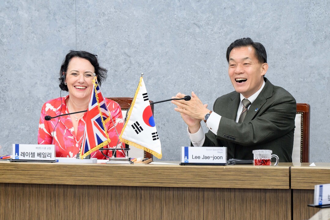 | ▲ 이재준 수원특례시장(오른쪽)과 베넨든스쿨 레이첼 베일리(Rachel Bailey) 교장이 협약식에서 대화를 나누며 웃고 있다. [수원시 제공] |