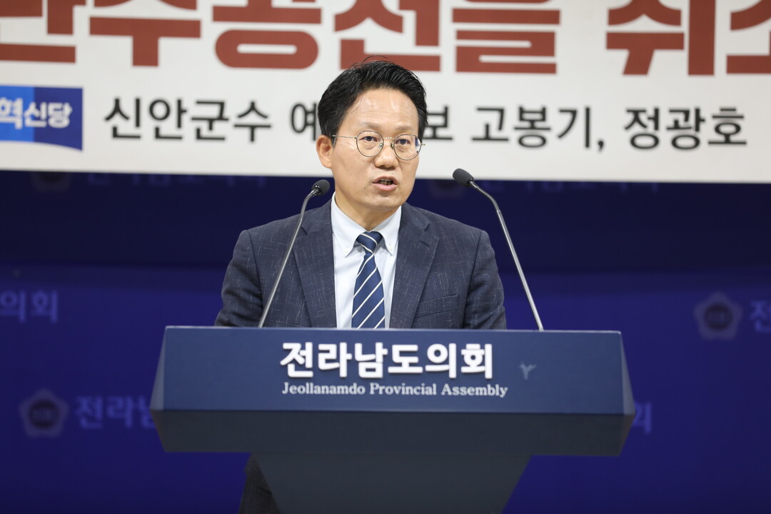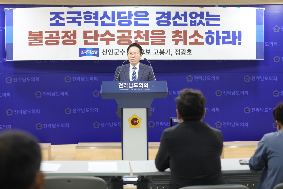 정광호·고봉기 조국혁신당 신안군수 예비후보는 27일 전남도의회에서 기자회견을 열고 당의 공천 과정을 비판하며 "조국혁신당은 경선없는 불공정 단수공천을 취소하라"고 주장했다.