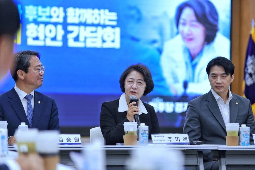 ▲ 29일 경기도의회에서 열린 더불어민주당 경기도 지역위원회 현안간담회에서 추미애 경기도지사 후보가 발언하고 있다. [추미애 SNS 캡처]