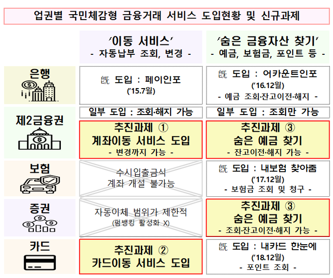 기존 계좌에 연결된 자동납부 내용을 한 번에 조회·변경·해지 할 수 있는 계좌이동 서비스와 숨은 금융자산을 찾아주는 서비스가 전 금융권으로 확대된다.