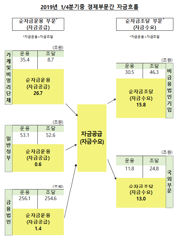 자금 운용이 조달보다 많으면 다른 부문에 자금을 공급하고, 자금 조달이 운용보다 많으면 다른 부문에서 자금을 공급한다. 통상 가계는 다른 부문에 자금을 공급하고, 기업은 다른 부문에서 자금을 공급받는 주체가 된다.