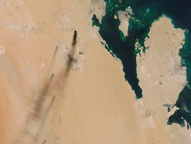 ▲ 미국 항공우주국(NASA)이 14일(현지시간) 제공한 아라비아반도 사우디아라비아 북동부 사진. 드론공격으로 불 타오르는 석유시설의 모습이 '검댕이'와 '붉은 빛'으로 나타나 있다.[AP 뉴시스]