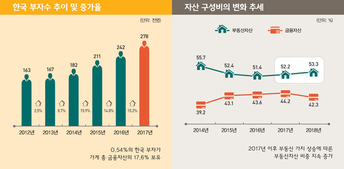 한국 부자 수는 2013년 16만7천명에서 매년 꾸준히 10%대의 성장률을 보여왔다. 자산규모도 2013년 369조원에서 두 배 가까이 늘었다. 이는 글로벌 경기 회복세와 주식시장 호황, 부동산 시장 가격 상승 등이 맞물린 효과로 분석됐다.