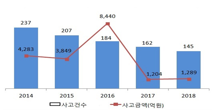 사고 건수는 2014년 237건, 2015년 207건, 2016년 184건, 2017년 162건 등으로 감소 추세다. 사고금액은 2017년보다 85억 원 늘었지만 건당 사고금액이 1000억 원을 넘는 초대형 사건은 없었다.