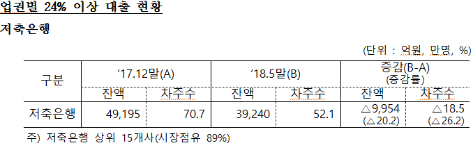 4일 전해철 의원이 금융감독원으로부터 받은 자료에 의하면 올해 5월 말 국내 저축은행 상위 15개사의 가계신용대출 가운데 금리가 연 24%를 초과하는 대출 잔액은 3조9240억원으로 밝혀졌다.