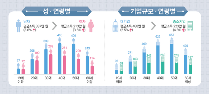 연령대별 남녀 평균소득 차이는 50대가 200만원으로 가장 컸고, 40대 165만원, 60세 이상 129만원, 30대 70만원, 20대 16만원, 19세 이하 5만원 순이었다. 여성은 30대(269만원)의 평균소득이 가장 높았고 남성은 40대(416만원)대가 가장 높았다.