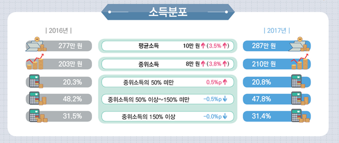 30일 통계청이 발표한 '2017년 임금근로 일자리별 소득 결과'에 따르면 2017년 기준 월평균소득은 287만원, 중위소득은 210만원으로 전년보다 각각 10만원(3.5%), 8만원(3.8%) 늘어났다.
