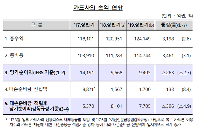 카드 수수료 인하의 여파로 카드사의 상반기 실적이 소폭 감소했다.