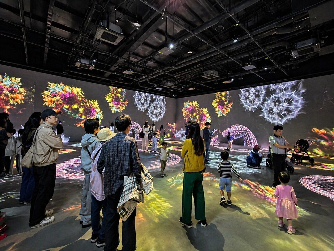 ▲ '디지털 정원 라원' 미디어아트 전시관에서 관람객들이 실감형 콘텐츠를 체험하고 있다. [경주시 제공]