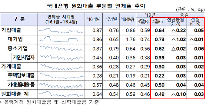 그러나 대기업과 중소기업·개인사업자 간 양극화는 감지되고 있다. 4월말 기준 기업대출 연체율은 0.64%로 전월말(0.59%) 대비 0.05%포인트 상승했다. 대기업대출 연체율이 0.01%포인트 하락한 가운데, 중소기업과 개인사업자 대출 부문에서 연체율이 각각 0.06%포인트, 0.01%포인트 올랐다. 가계대출 연체율은 0.30%로 전월말 대비 0.02%포인트 상승했다.