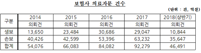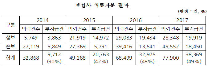 보험사가 의뢰한 2014년 의료자문은 총 5만4076건으로 이중 자문 결과를 인용해 보험금지급을 거절한 것은 9천712건으로 전체 30% 수준이었다. 매년 의뢰건이 증가해 2017년 보험사 의료자문 건수는 9만2279건으로 집계됐고 보험금 지급 거부사례도 전체 의뢰의 50%에 달했다.