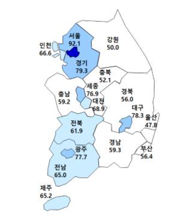분양사업에 대한 기대감이 높았던 서울의 10월 HSSI 전망치는 92.1로 지난달보다 27.5포인트나 급락했다. 이어 울산이 27.2포인트 하락한 47.8, 세종은 27.1포인트 하락한 76.9를 기록했다.