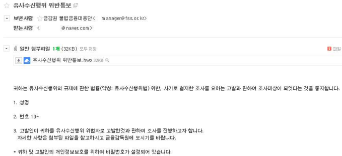 이메일에는 "유사수신행위법 위반 및 사기 고발 사건과 관련하여 금감원의 조사대상이 됐다"며 "조사를 위해 주민등록증 및 은행 통장을 준비하여 금감원에 13일까지 오라"고 적혀있다.