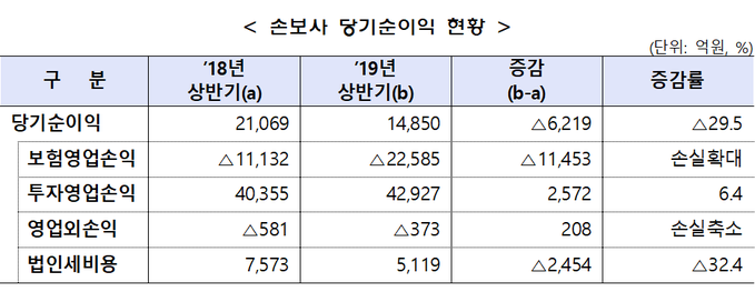 국내 손해보험사들의 올해 상반기 순이익이 약 30% 감소했다.