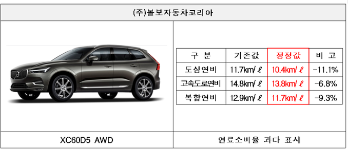볼보자동차코리아에서 수입·판매한 XC60D5 AWD 3533대는 연료소비율 과다 표시로 과징금을 받게됐다. 이는 자동차관리법 제31조 제1항 단서규정에 따른 것으로 시정조치 대신 소비자에 대한 경제적 보상을 실시할 예정이다.
