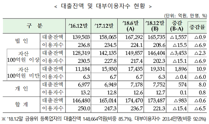 1일 금융위원회와 금융감독원, 행정안전부가 조사한 '2018년도 하반기 대부업 실태조사 결과'에 따르면 지난해 12월 말 기준 대부잔액은 17조3487억원으로 지난해 상반기 대비 938억원(-0.6%) 감소했다.