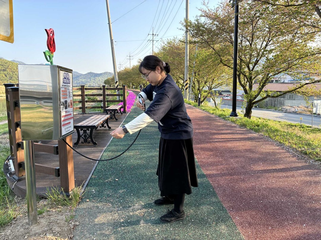▲ 무안면 청도천 제방에 설치된 해충기피분사제를 방문객이 사용하고 있다. [밀양시 제공]