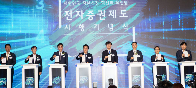 금융위원회와 법무부, 예탁결제원은 이날 오전 서울 여의도 콘래드호텔에서 은성수 금융위원장과 조국 법무부장관, 이병래 예탁결제원 사장, 전자증권법을 대표발의한 더불어민주당 이종걸 의원 등이 참석한 가운데 '전자증권제도 시행 기념식'을 열었다.